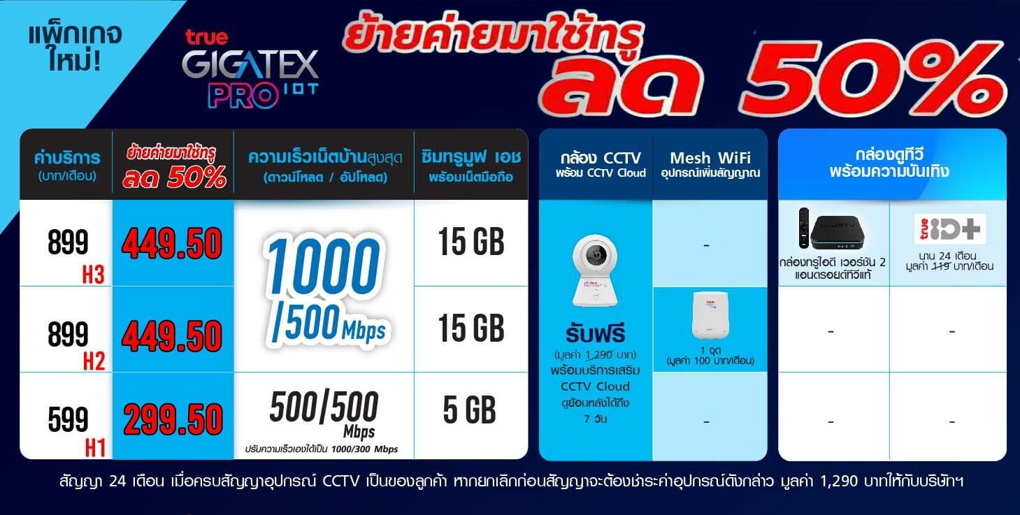 แพ็คเกจ H3 ราคา 499.50 (899 ลด 50 % 24 เดือน ) ได้กล่องเราเตอร์ไวไฟ สีขาวแบบ 6 เสา รุ่น gigatex ความเร็ว 1000/500 ,ได้กล้อง CCTV ฟรี 1 จุด ,ได้กล่องทีวี TrueID TV V.2 , แถม ซิมโทรศัพท์รายเดือน ให้เล่นเน็ต 15 GB แถมชมพลีเมียนลีก 2 คู่ ต่อสัปดาห์