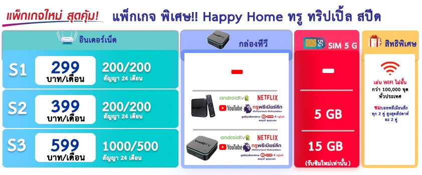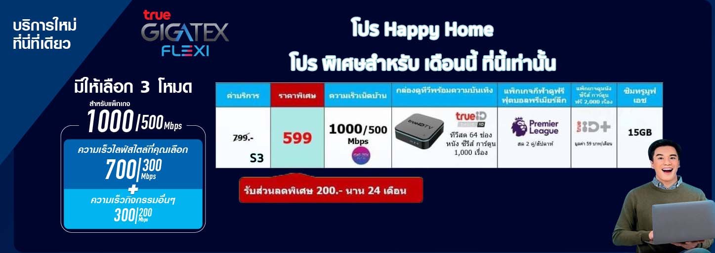 แพ็คเกจ S3 ราคา 599 (จากราคาปกติ 799 ลด ให้ 200 บาท ตลอดอายุการใช้งาน ได้กล่องเราเตอร์ไวไฟ ความเร็ว 1000/500 , สีขาวแบบ 6 เสา รุ่น gigatex ,ได้กล่องทีวี TrueID TV V.2 แถม ซิมโทรศัพท์รายเดือน ให้เล่นเน็ต 15 GB แถมชมพลีเมียนลีก 2 คู่ ต่อสัปดาห์