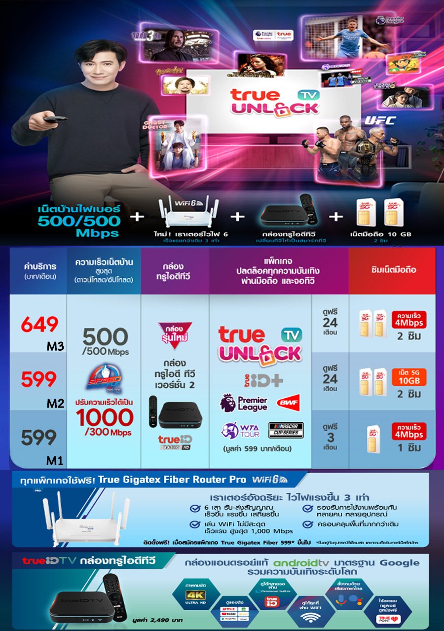 แพ็คเกจ M3 ราคา 649 ได้กล่องเราเตอร์ไวไฟ สีขาวแบบ 6 เสา รุ่น gigatex ความเร็ว 500/500 ปรับความเร็วได้เป็น 1000/300 , ได้กล่อง TrueID TV V.2 ปลดล็อค True UnLock TV ฟรี 24 เดือน แถม ซิมโทรศัพท์รายเดือน 2 ซิม ให้เล่นเน็ต อัลลิมิเตด ความเร็ว 4 MBPS สัญญา 24 เดือน