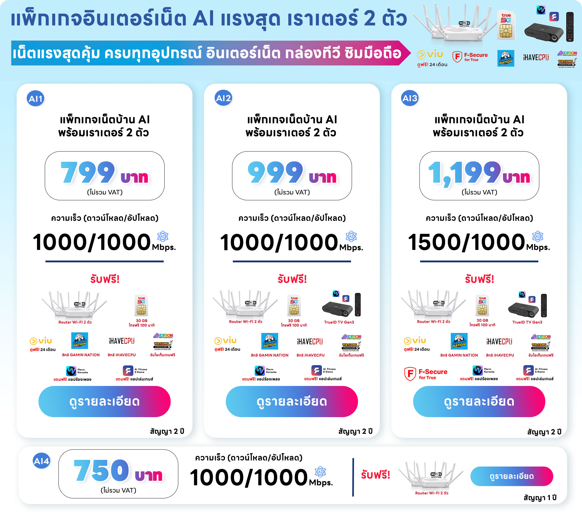 แพ็กเกจ AI2 ราคา 999 บาท ( รวมภาษี 1,068.93 บาท)