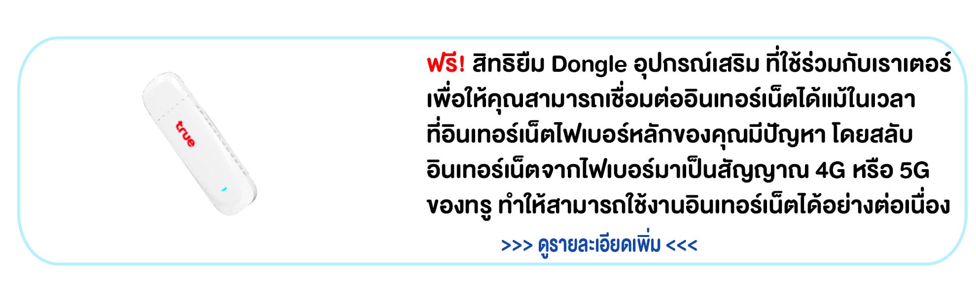 Dongle คือ เป็นอุปกรณ์เสริมที่ใช้ร่วมกับเราเตอร์เพื่อให้คุณสามารถเชื่อมต่ออินเทอร์เน็ตได้แม้ในเวลาที่อินเทอร์เน็ตไฟเบอร์หลักของคุณมีปัญหา โดย Dongle จะทำหน้าที่เป็นเหมือนตัวกลางในการสลับสัญญาณอินเทอร์เน็ตจากไฟเบอร์มาเป็นสัญญาณ 4G หรือ 5G ของทรู ทำให้คุณยังสามารถใช้งานอินเทอร์เน็ตได้อย่างต่อเนื่อง