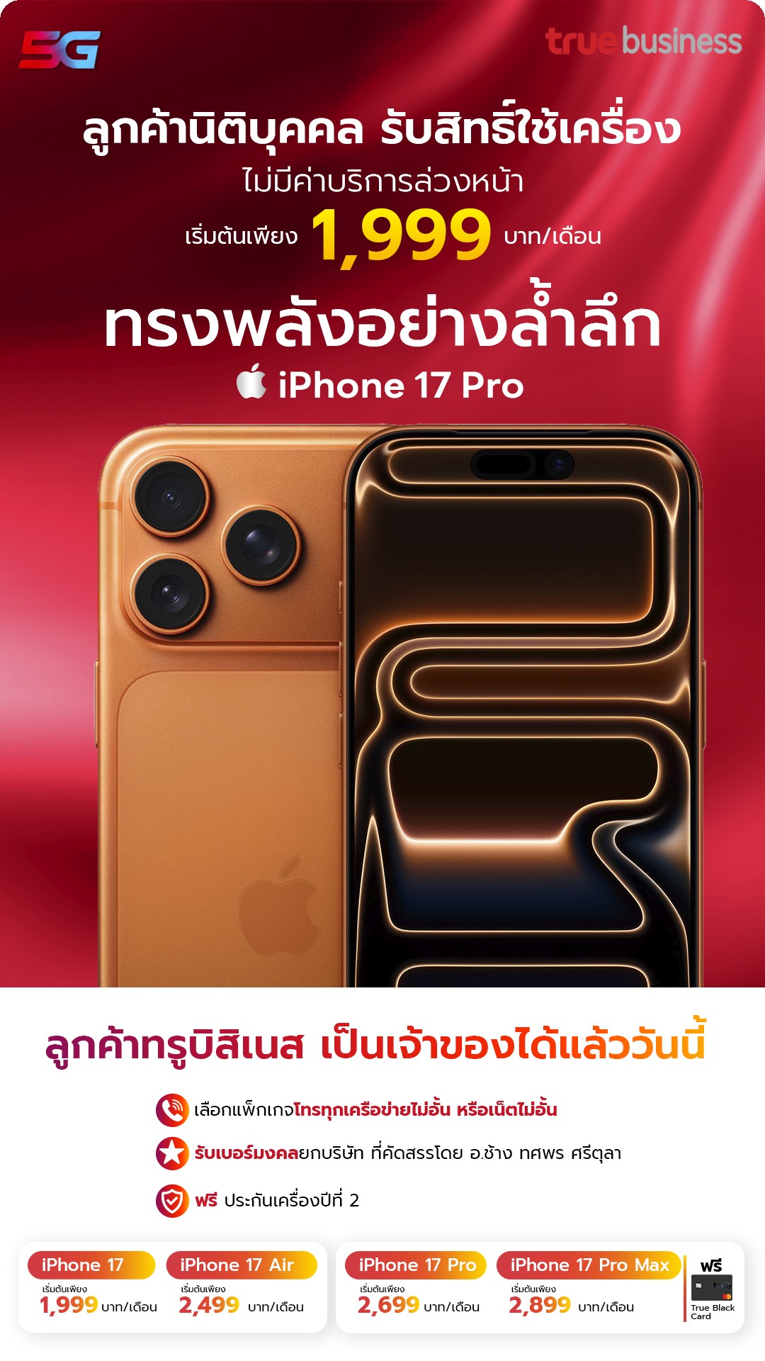 ลูกค้านิติบุคคล เป็นเจ้าของได้แล้ววันนี้ พร้อมรับสิทธิ์ใช้เครื่อง iPhone 17 Pro หรือ iPhone 17 Pro Max พร้อมแพ็กเกจ