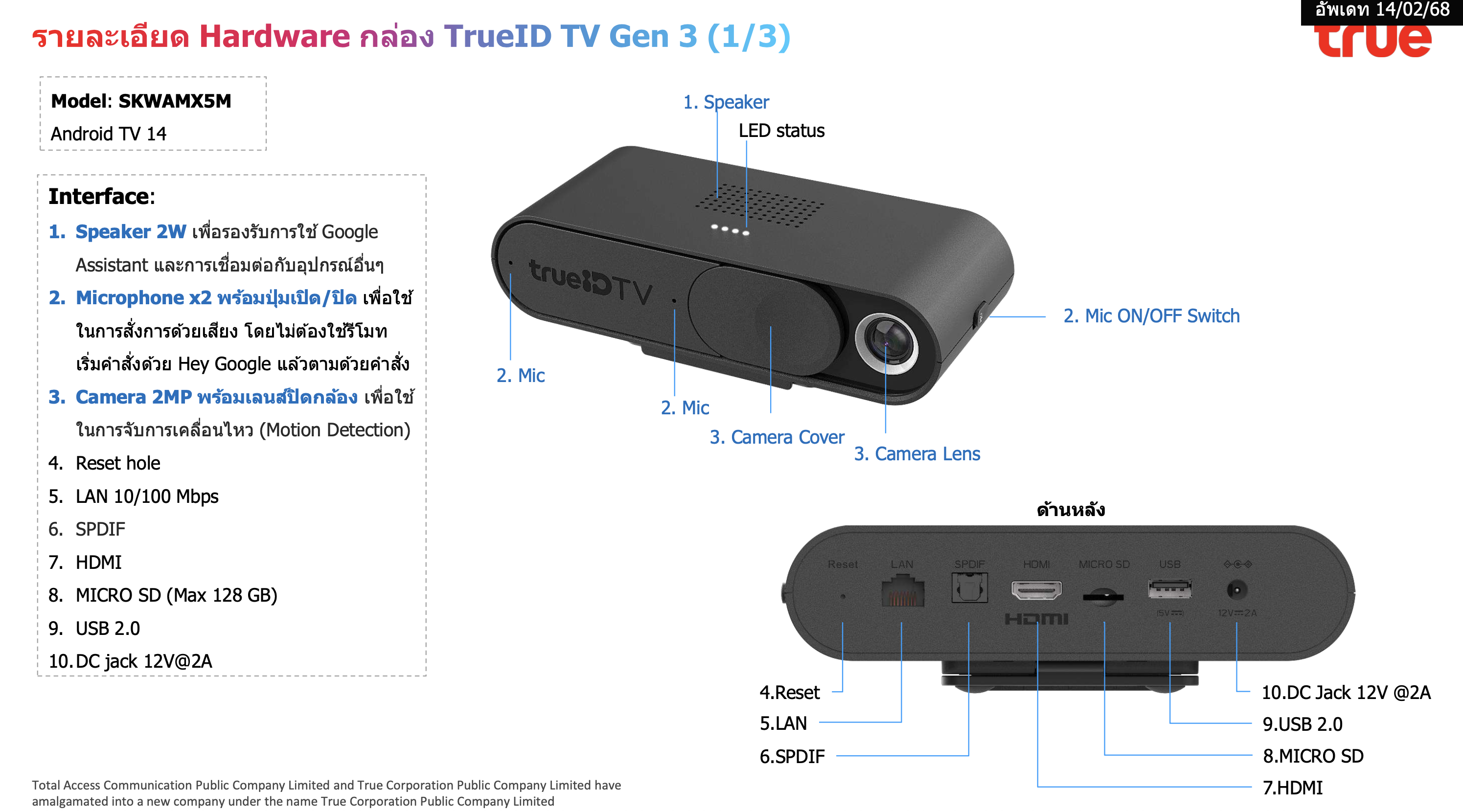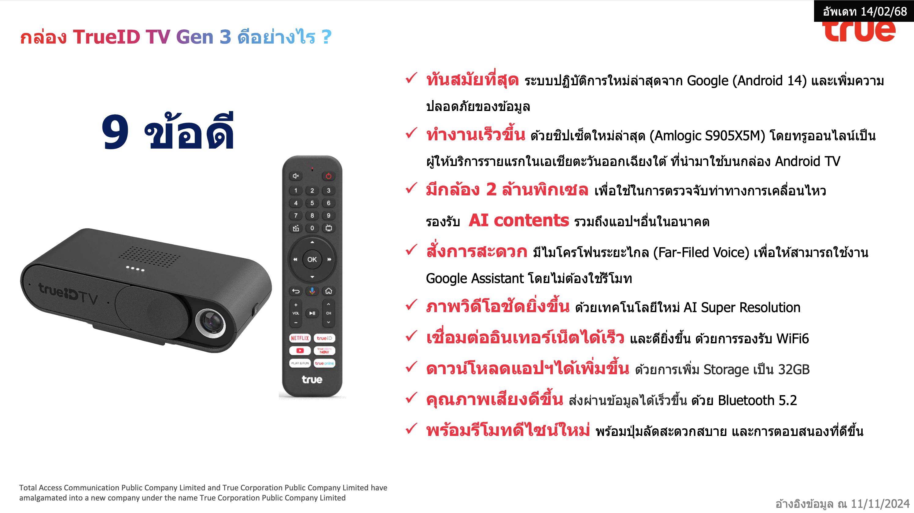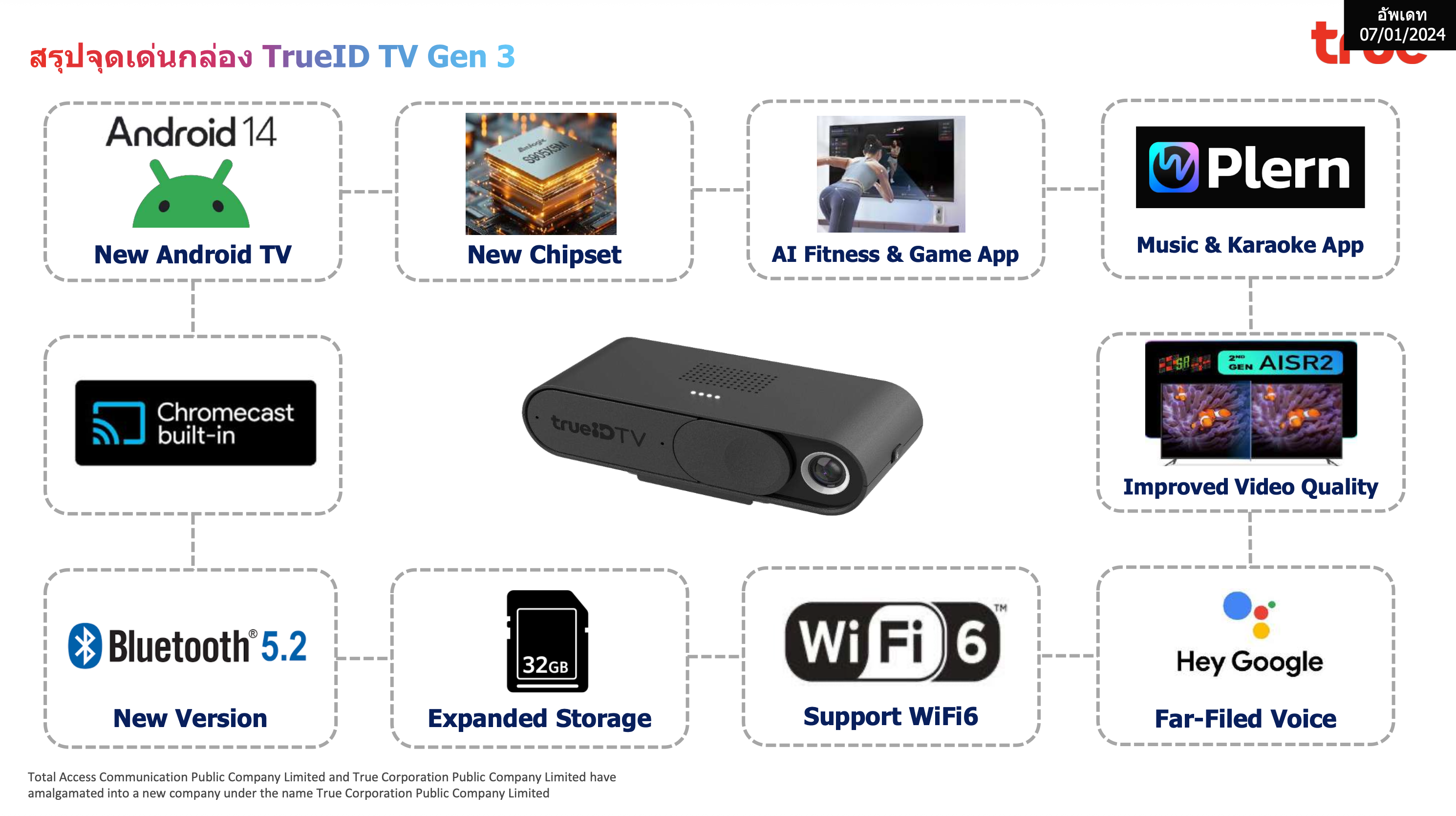 กล่อง TrueID TV Gen 3 เป็น กล่องทีวี AI อัจฉริยะ จากทรูออนไลน์ ที่โดดเด่นด้วย กล้อง AI ในตัว เพื่อรองรับคอนเทนต์ AI อย่างการออกกำลังกายและเล่นเกมที่ใช้การเคลื่อนไหว นอกจากนี้ยังมาพร้อมดีไซน์ใหม่, ระบบปฏิบัติการ Android 14, ชิปประมวลผล AI ใหม่ล่าสุดที่เร็วและแรงกว่าเดิม, และฟีเจอร์อื่น ๆ เช่น Google Assistant, Plern Karaoke, และการดาวน์โหลดแอปพลิเคชันได้มากขึ้น